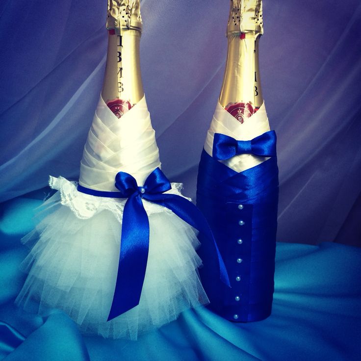 Оформление бутылок шампанского «Жених» и «Невеста» в синем цвете за пару ( 2 шт).