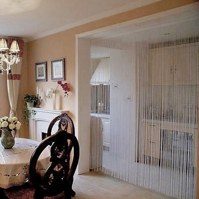 Часто применяют дверные шторы висюльки, позволяющие свободно проходить сквозь них. Видимость изоляции и свободное перемещение сквозь них будут хорошим решением для гостиной или столовой, а также в других комнатах, не требующих изоляции от свободного прохода.
