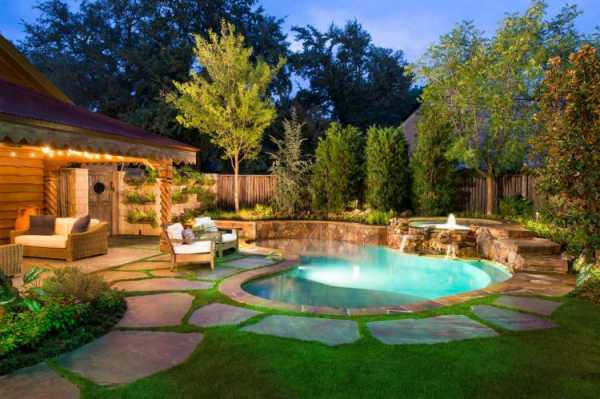 На фото обустройства двора частного дома часто можно увидеть разнообразные водоемы, начиная от вместительного бассейна, заканчивая маленьким прудиком размерами с таз, но с настоящим водопадом.