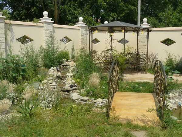 - Зону отдыха с уютной беседкой, удобным гамаком, красивыми глиняными или керамическими фигурками; небольшим декоративным фонтанчиком или озером с мостиком.