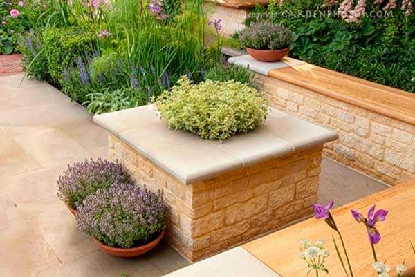 Очень хорошо будут смотреться элементы из камня, а также низкие скамеечки, вечнозеленые насаждения и альпийская горка.
