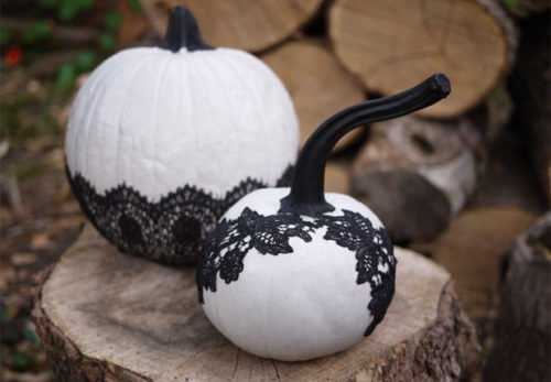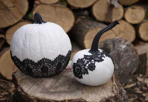 Делаем все по фото: красим саму тыкву белой краской, а хвостик черной, приклеиваем кружево. Ваша чудо украшение к Хэллоуину сделанное своими руками готово.