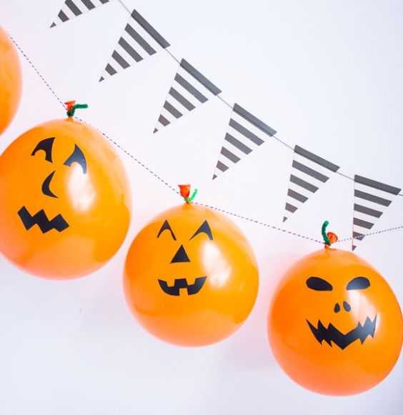 - Воздушные шарики. То, что воздушные шарики используются абсолютно на всех торжественных мероприятиях, знают все. А вот то, что из них можно сделать необычный декор на Хэллоуин это знают не все. Выберите основные цвета, среди которых должен обязательно оказаться черный. В качестве яркого акцента используют оранжевый цвет, символизирующий тыкву. Кстати, если перевязать шарик бечевкой и слегка ее затянуть, то получится имитация тыквы.