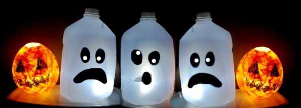 мой самый любимый элемент декора на Хэллоуин — светящиеся «страшные» фонарики. Красим банки и бутыли яркими сверкающими красками. Рисуем или клеем на них забавные рожицы, фигурки приведений, пауков и летучих мышей. А затем, кладем внутрь цветные гирлянды. В темноте такая красота смотрится просто шикарно!