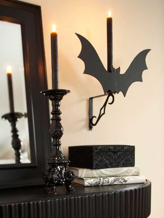 Можно навырезать из чёрного картона летучих мышей и подвесить их на нитках. А можно сделать из бумажных летучих мышей целую композицию на стене. Кстати, она отлично подойдёт для тематической фотосессии!
