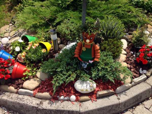 Для создания интересных тематических инсталляций используют несколько контейнеров с высаженными цветами, керамические фигурки животных, птиц, сказочных персонажей, добавляют солнечный фонарик, россыпь больших и малых камней разного цвета и других стильных элементов декора, дополняющих композицию. Стильно смотрится небольшой искусственный водоем из емкости, наполненной водой и пары зеленых «лягушат» в окружении стелящихся цветов и осоки. Импровизированный ручеек получается из лежащего горизонтально кувшина, из которого струится цветочная вода.