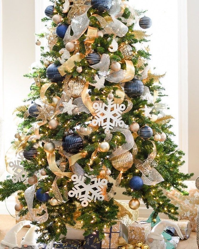 Синий и голубой – исключительно зимняя палитра, напоминающая нам снег, зимнее небо и мерцающими звезды. Все оттенки синего подарят умиротворение и ощущение прохлады, помогут расслабиться и снять эмоциональное напряжение. Но чтобы елочка не казалась слишком холодной, ее стоит поставить у камина или хотя бы украсить золотыми лентами.