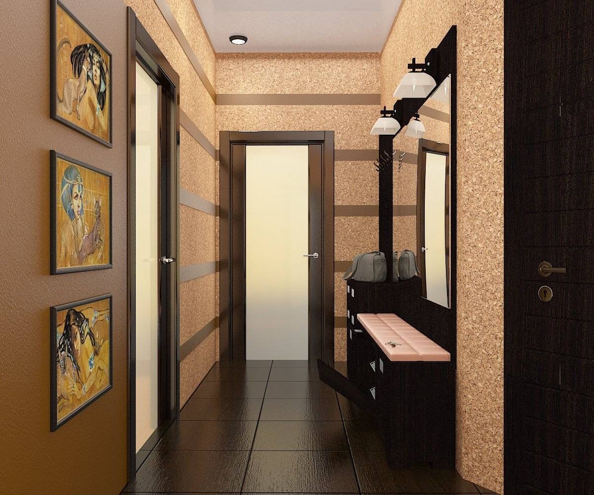 Чтобы оригинально украсить и украсить маленькую и сумрачную прихожую в «хрущевке», не рекомендуется использовать много декоративных элементов. Идеальным вариантом будет, если на одну из стен поклеить фотообои или повесить небольшую картину, соответствующую тематике стиля. Можно сделать полностью зеркальный коридор; для этого в стены и двери придется встроить большие стекла и зеркала. Дополнит эту красоту подсветка затемненных уголков.