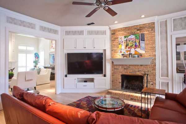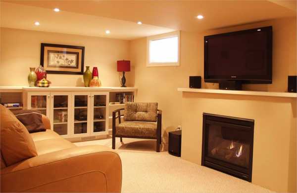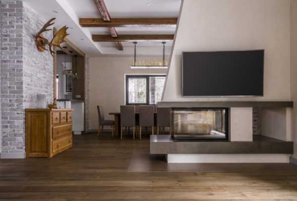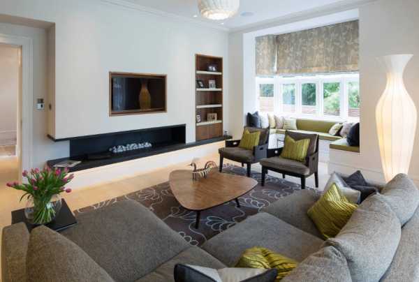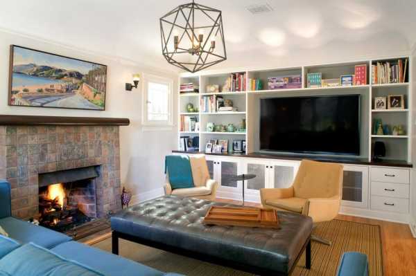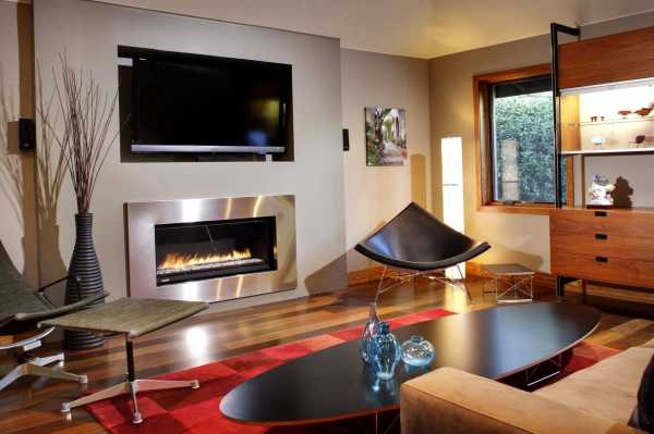 Решить возникшую проблему можно двумя способами. Во-первых, разделить гостиную на две зоны — для развлечений у телеэкрана и отдыха у огня, желательно, в разных частях. При этом камин может быть настоящим, если речь идет о частном доме. Технику рекомендуется вписать в мебель, отвлекая внимание от ее современного вида.