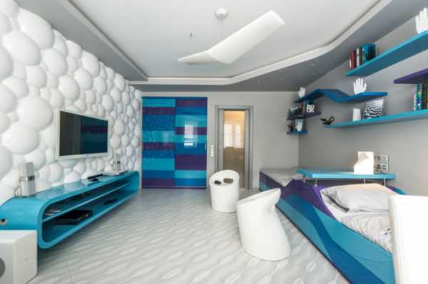 Для детской размещение телевизора на стене, является самым оптимальным и безопасным. Тв-зону желательно выделить светлым фоном или украсить подвесными полочками, которые можно заполнить разными книгами или детскими игрушками. Устройство следует располагать на уровне глаз ребенка, оно не должно иметь слишком низкий или слишком высокий монтаж.