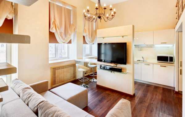 Сюда подойдут компактные и удобные тв-устройства, которые не станут мешать и будут хорошо просматриваться, как из кухни, так и из столовой. Достаточно часто в данной комнате применяют угловое размещение телевизора, монтируют его в нишу или кухонную мебель