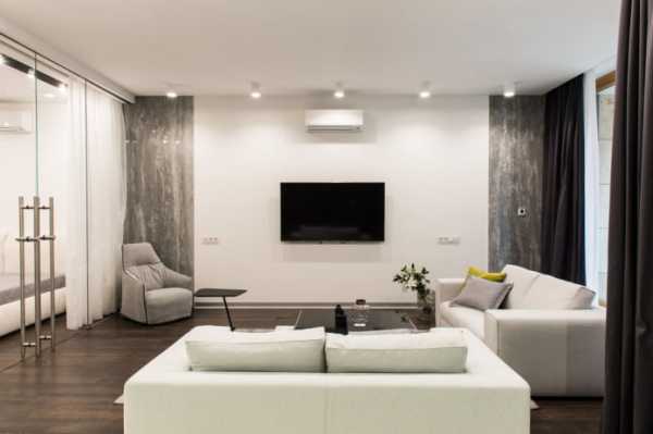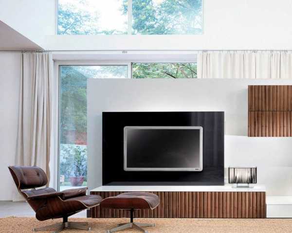 А вот телевизор черной или белой расцветки — совсем другое дело. Тогда как со снежно-белой стеной «хайтековой» гостиной телевизор белой расцветки, наоборот, не станет выглядеть гармонично.