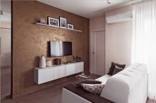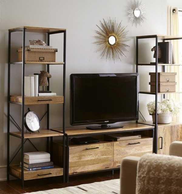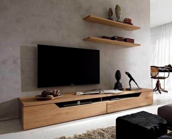 В качестве опоры может служить стенка в просторных помещениях или небольшая ТВ-тумба в малогабаритках. Впрочем, если нет необходимости в дополнительных местах хранения, можно остановиться на минималистичном варианте, так как сдержанное предметное наполнение актуально в современном дизайне.