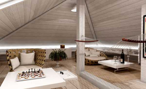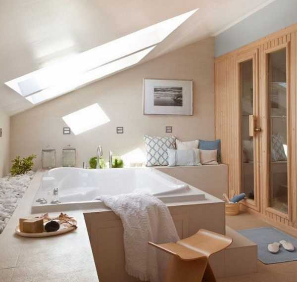 Но, если удастся решить коммуникационные и конструктивные вопросы, весь чердак можно отдать под зону релакса. Кроме ванной и душевой кабины, можно разместить и кабинку сауны и даже небольшой бассейн, массажный стол и другие атрибуты способствующие хорошему отдыху и восстановлению сил.