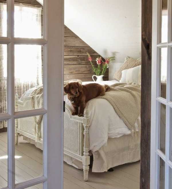 Много выбеленной, искусственно состаренной древесины в сочетании с палитрой летнего пейзажа (васильковые оттенки, лаванда, лимон, небесно-голубые и зеленые) сделают мансардную спальню особенно уютной, пропитанной деревенской романтикой.