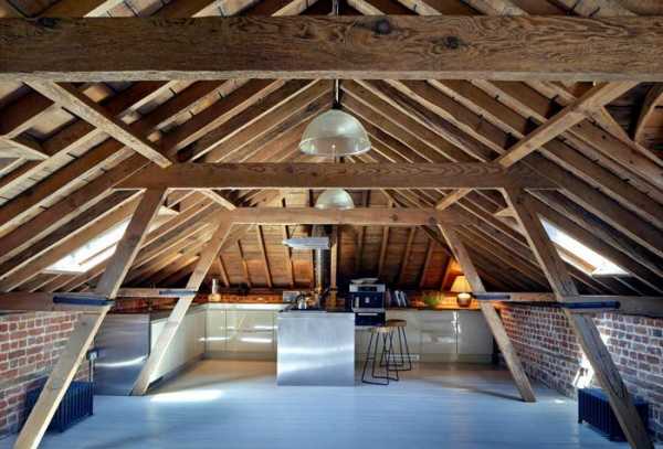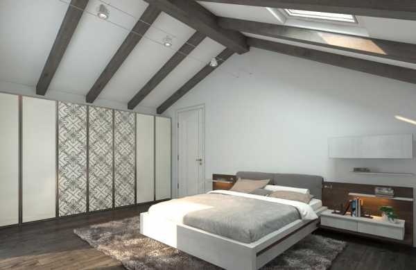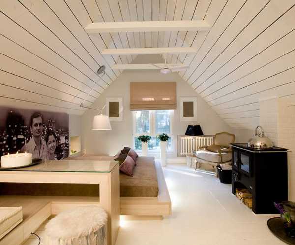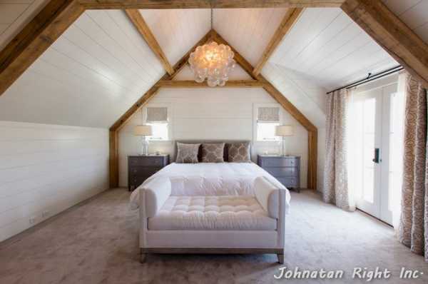 Отдельно следует поговорить про мансарды с высокой крышей, доходящей до 3-5 метров. Спальня с такой высокой треугольной вершиной не очень будет уютной. Поэтому для того, чтобы перекрыть высокое пространство нередко дополняют его поперечными балками (если их нет). Таким образом не только перекроется высота, но будет легче провести главное главное освещение в комнату.