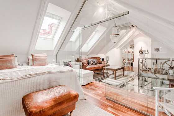 Спать в мрачном не обустроенном чердаке не комфортно и страшно, а вот спальня в уютной теплой мансарде — это другое дело. Засыпать на мягкой кровати глядя в окно на звездное небо одно удовольствие, сны точно приснятся яркими и сказочными. Поэтому, если у вас свой частный дом, не упускайте такой возможности и смело оборудуйте спальню на мансарде. Таким образом темное, пыльное и страшное место, вполне может стать любимой вашей комнатой.
