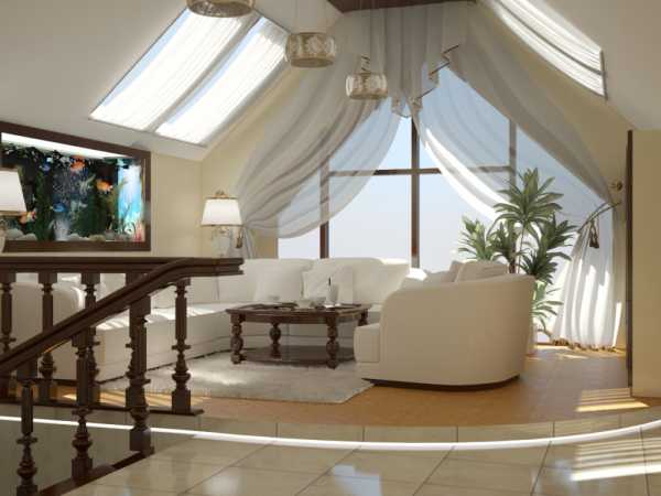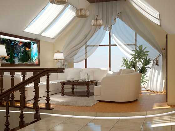 ♦ Шаг 4. Оформление окон. Гостиная нуждается в обилии естественного освещения, поэтому задумайтесь об установке в мансарде панорамных окон или оконных мансардных систем с монтажом на крышных скатах. Занавески, шторы выбирайте из светлых, легких тканей. Хорошо будут смотреться и жалюзи. Подбирайте такое оконное убранство, которое будет позволять полностью открывать окна.