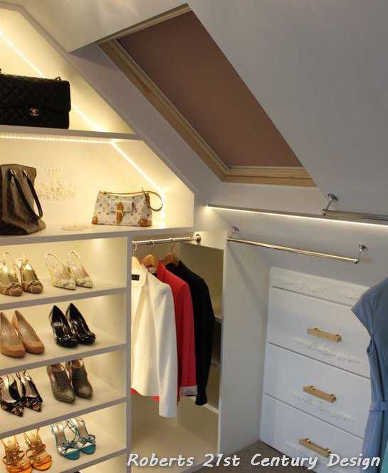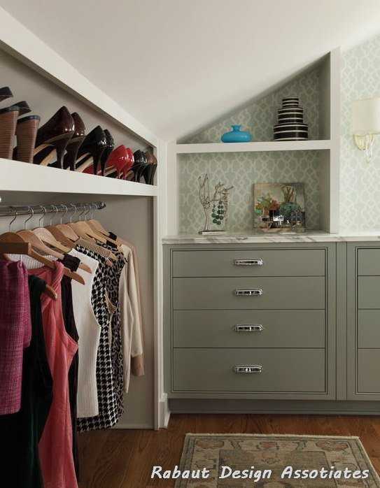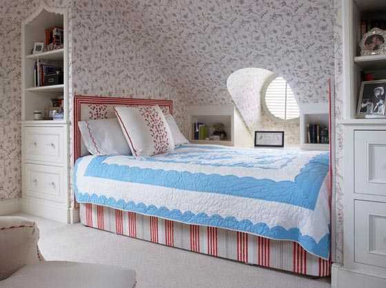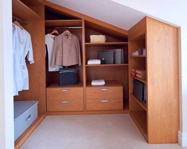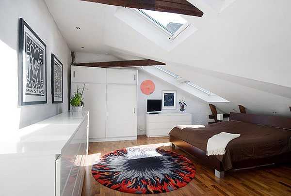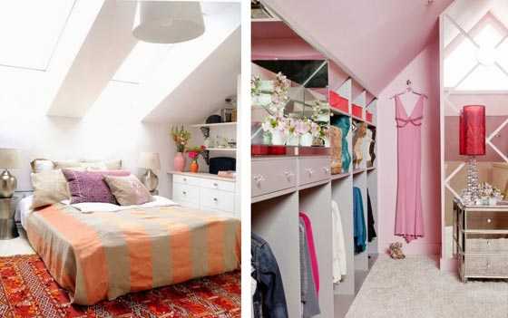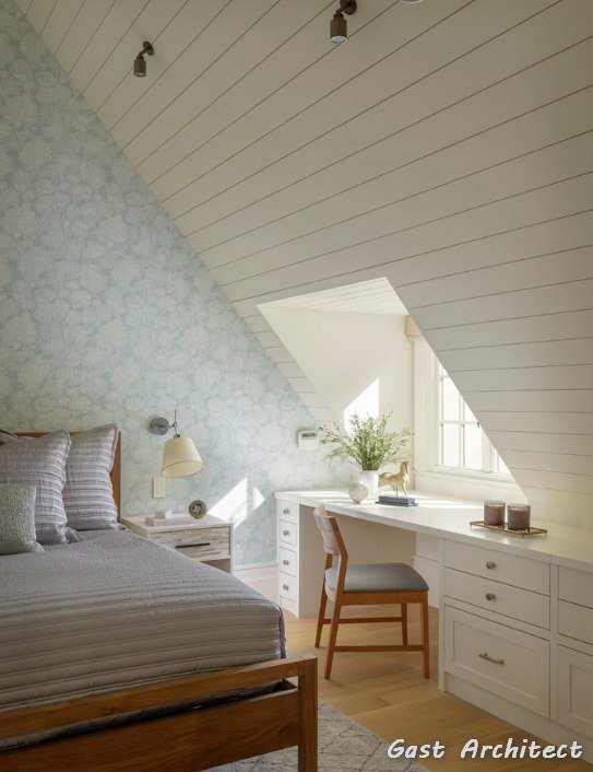 Удачный интерьер – не просто правильно размещенная кровать, но и грамотное использование оставшегося свободного пространства у стены. В такое помещение не впишется корпусная мебель для хранения вещей, потому как потолок наклонного типа. В таком случае стоит заказать встроенную мебель по своим эскизам и меркам.