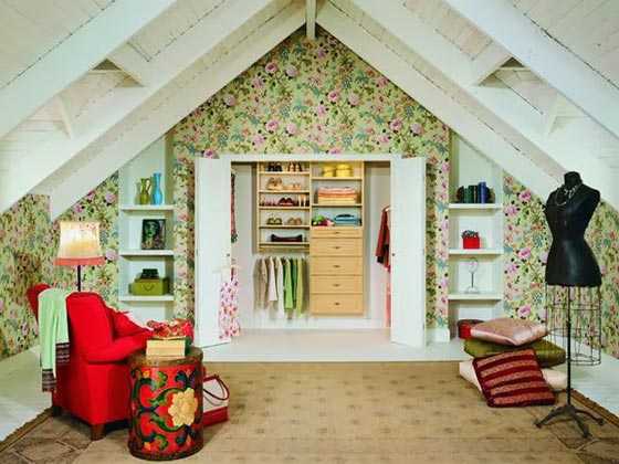 Чтобы на чердачной спальне было светло, не достаточно порой бывает окон и искусственного освещения. Чтобы развеять устоявшийся стереотип, что чердак это темное место, для оформления следует выбирать светлые цвета. Например, светлые обои в цветочек привнесут не только света, но и оригинальности и уюта. Яркое оформление стен также привнесет больше эмоций в обстановку комнаты.