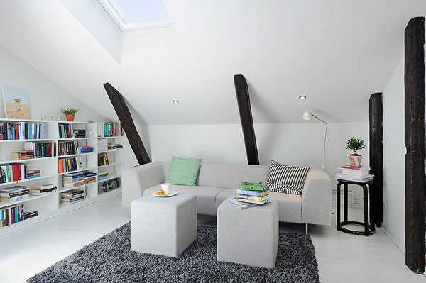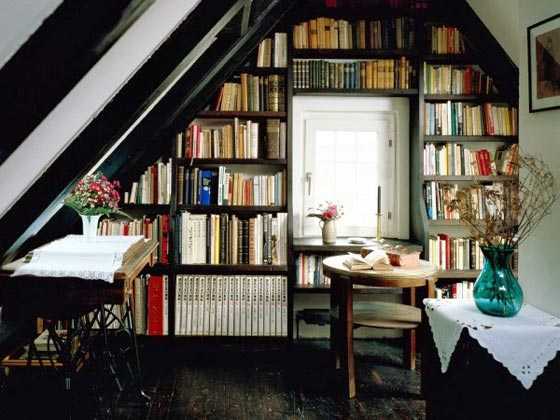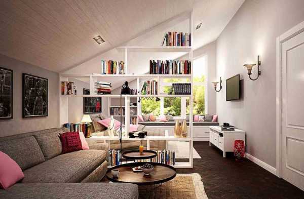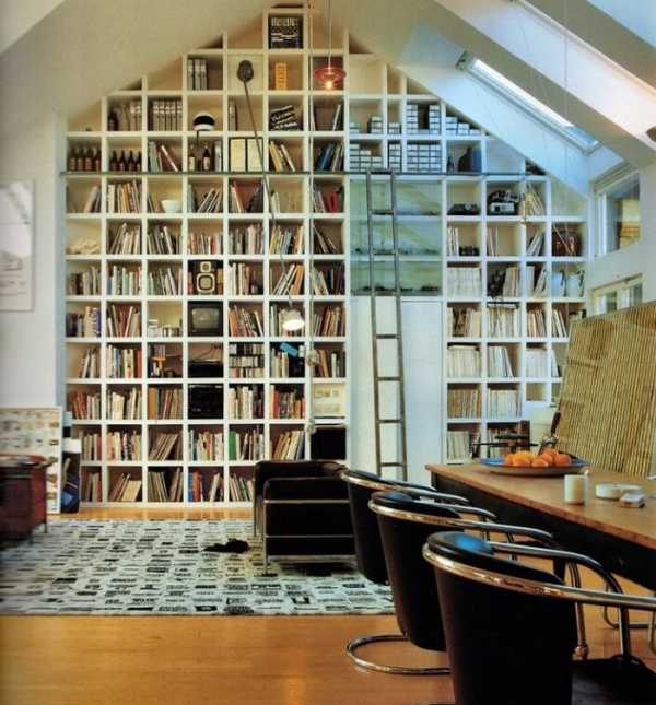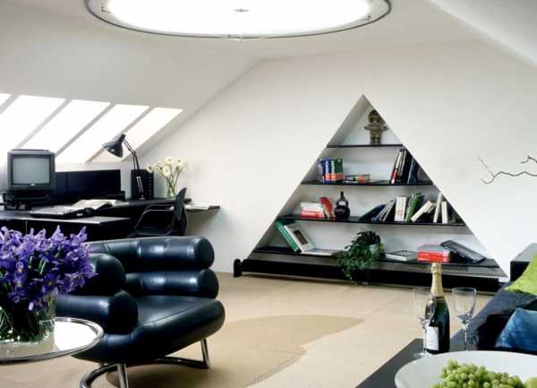 Совет! Для создания гармонии размещайте стеллажи, полки по углам мансардного помещения – это сделает комнату более объемной и глубокой.