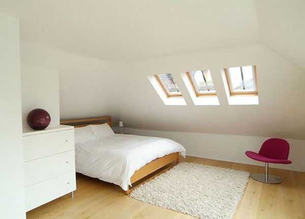 Максимум дневного света от низких маленьких окон в мансардной комнате можно добиться с помощью хорошо рассеивающих свет белых стен и потолка