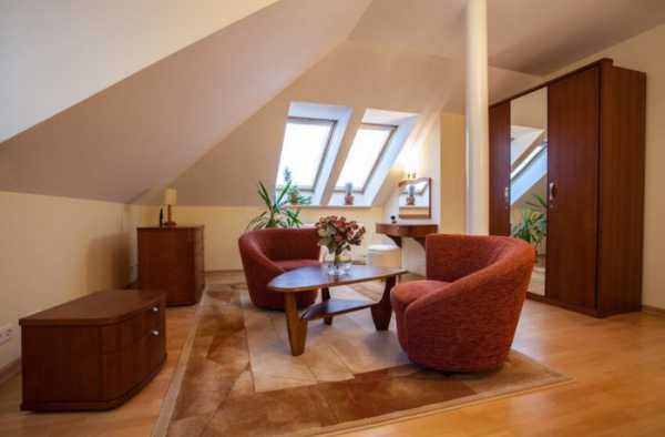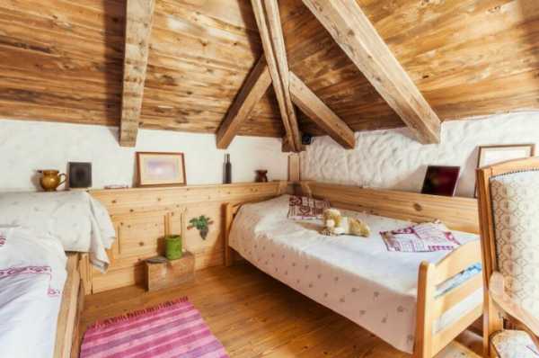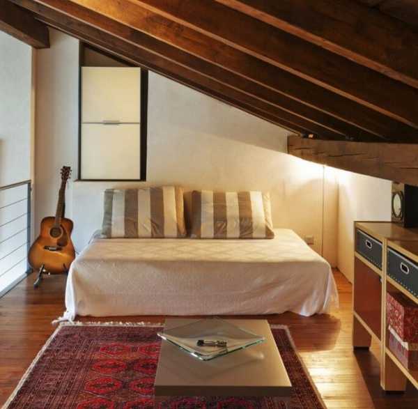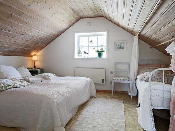 Если чердак невысокий и в нем почти невозможно стоять в полный рост, то комната отдыха в нем станет практически идеальным решением. Размещать двуспальную кровать в такой спальной неразумно, поскольку подниматься с нее будет неудобно, да и потеряется место. Эргономичнее установить две кровати вдоль скоса потолка. Тогда самое высокое место на мансарде останется свободным и как следствие ложится и вставать с кроватей станет намного удобнее.