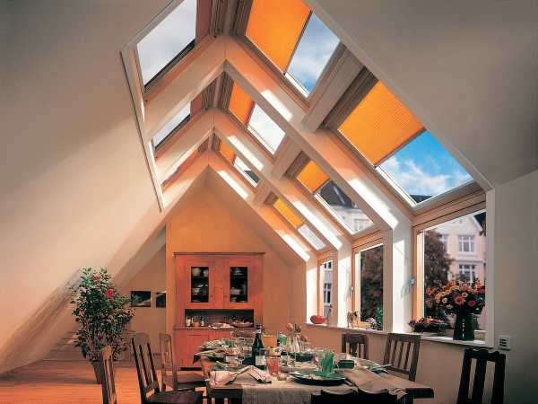 Сложную систему окон в мансардной кровле можно украсить и сделать функциональнее, дополнив ее рулонными шторами