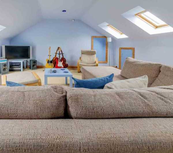 Чердачное помещение, где центральным предметом интерьера является большой диван с множеством мягких подушек, станет лучшим местом в доме для досуга с друзьями