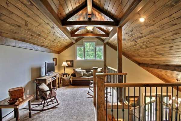 Полностью обшитый потолок без несущих конструкций, как на фото ниже, выглядит не менее стильно и уютно, к тому же, такое решение вполне оправдано при обеспечении теплоизоляции будущей жилой комнаты.