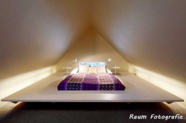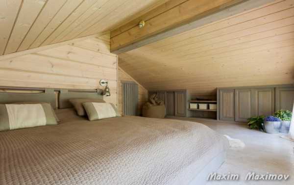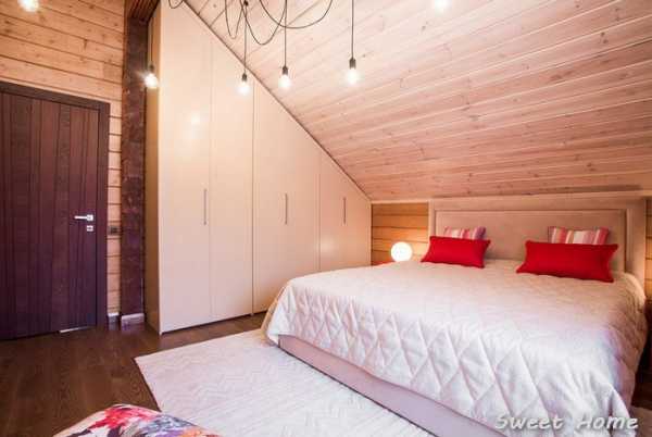 Спальня в верхней части дома способствует хорошему сну, еще и потому что она отдалена от активных помещений, кухни, гостиной, детской и т.п. До нее меньше доносятся посторонние, мешающие спать звуки. Да и энергетически в спальне комфортно, когда над головой нет больше комнаты. Спокойный отдых таким образом точно обеспечен. Возможно покою еще и способствует двускатная крыша такой спальни, ведь известно что пирамидальные формы способны привносить особенные энергии в интерьер.