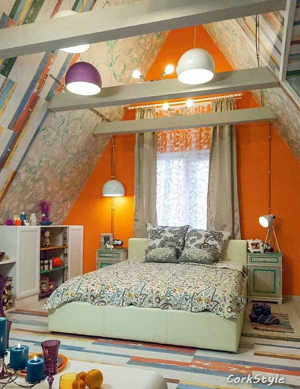 Совет! Если вам хочется внести яркие брызги разнообразия, нанесите насыщенные цвета на центральную стену мансарды. Можно также выкрасить самую высокую стену в броские оттенки – такой прием еще и дополнительно увеличит объем комнаты.