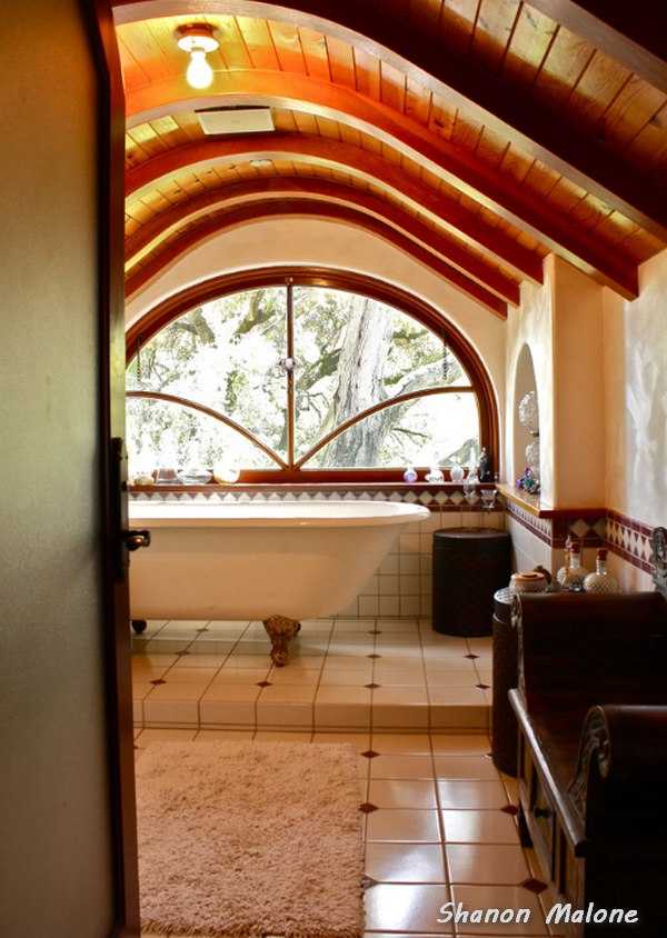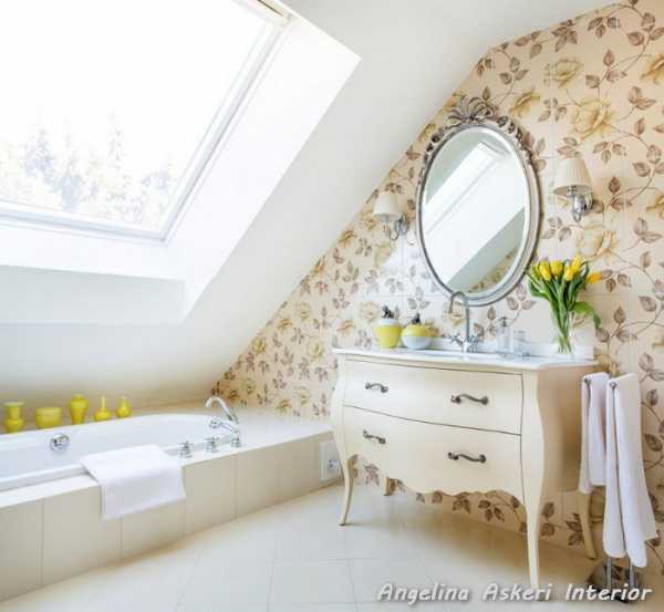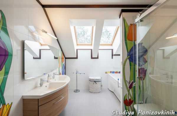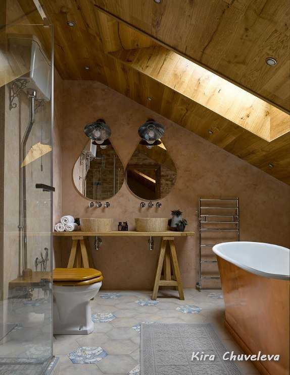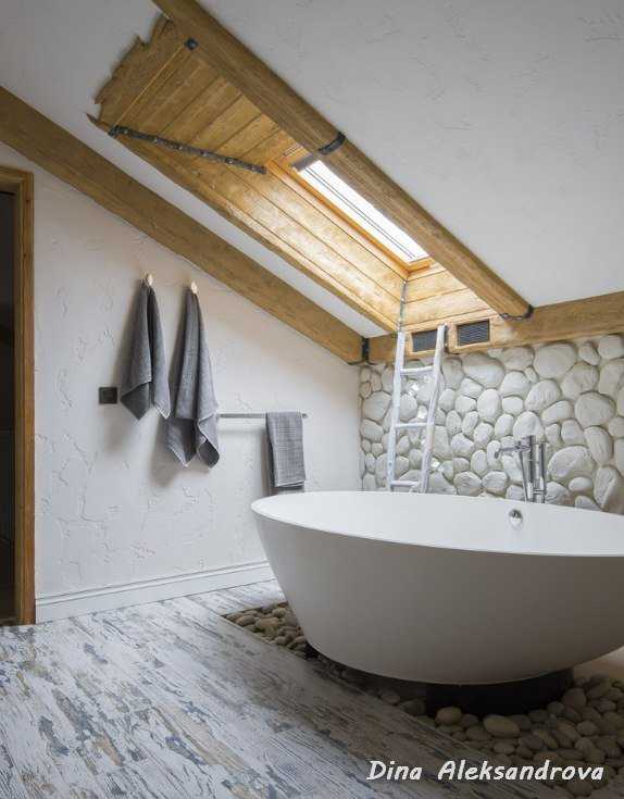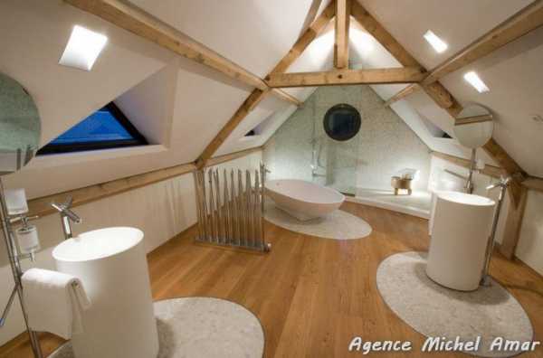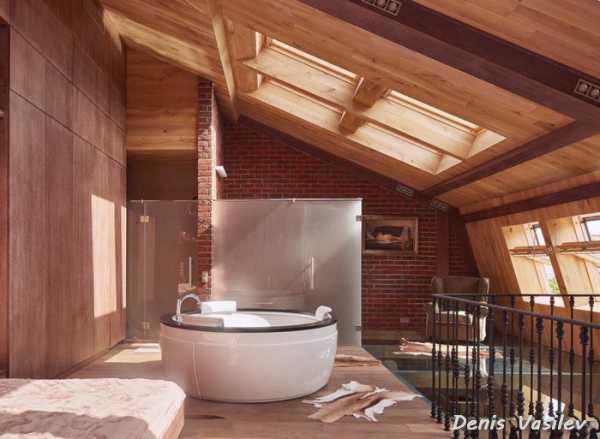 Ввиду того, что стены на чердаке косые, необходимо произвести правильное планирование. Как правило ванна устанавливается прямо под скатным потолком. Весьма удобно если над ней будет расположено окно. Принимать ванную и смотреть на звезды или облака — в вечернее время — потрясающее удовольствие.
