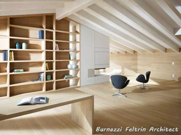Очень высокий свод крыши можно использовать как основу для нестандартных решений в проектировании мебели