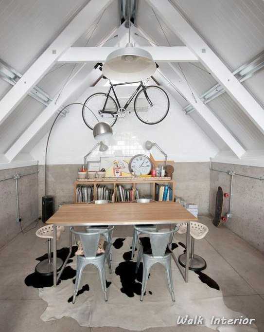 Скошенные стены можно выгодно подчеркнуть подвесными аксессуарами (свет, мебель и другое)
