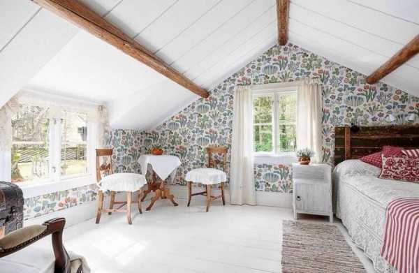Деревенский шик мансарде можно придать с помощью состаренной древесины в отделке стен, кованой мебели и уютного текстиля с цветочными узорами