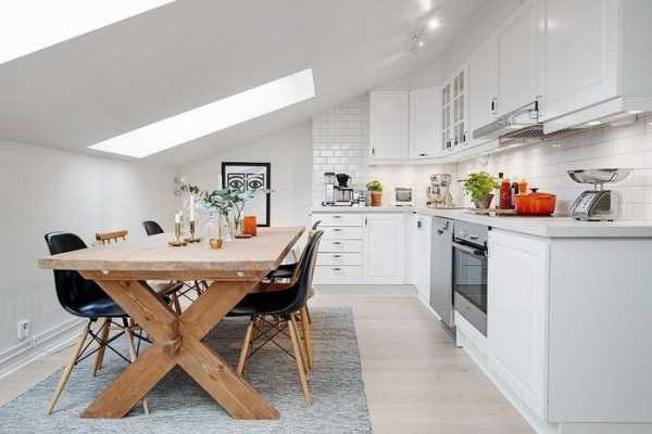 Удобная планировка кухни-столовой в мансардном помещении: рабочая зона под скошенными стенами
