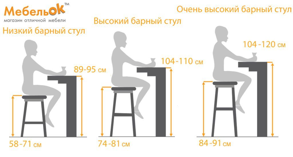 Немного другая ситуация с барными табуретами. Чтобы правильно выбрать модель, нужно отнять от высоты стойки 35-40 см.