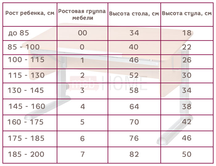Для детей ростом 110-120 см подойдут столы высотой 52 см, стулья — 32-35 см. Оптимальный вариант — мебель с механизмом трансформации. По мере роста ребенка можно увеличивать высоту изделий.