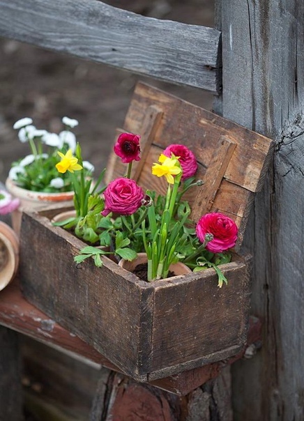 - у старой деревянной тумбочки столешница местная как подставка под кашпо, а выдвижные ящики — наполнить землей и высадить в цветы. Перед тем, как наполнить емкости землей, ящики необходимо застелить полиэтиленом или спанбондом, для надежности закрепить их строительным степлером. Следует обработать специальными защитными средствами-антисептиками, чтобы продлить срок службы всей этой деревянной клумбы.