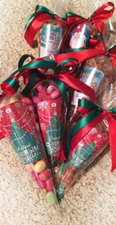 Ненужные баночки, лампочки и пробирки можно наполнить любимыми вкусностями (орешками, драже M&M’s, мармеладками) и украсить в новогоднем стиле.