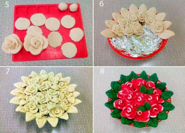 - Сделайте из шариков лепёшки и сформируйте розу. Одну лепёшку скрутите в трубочку, затем прикрепляйте по разным сторонам лепёшки, формируя лепестки.