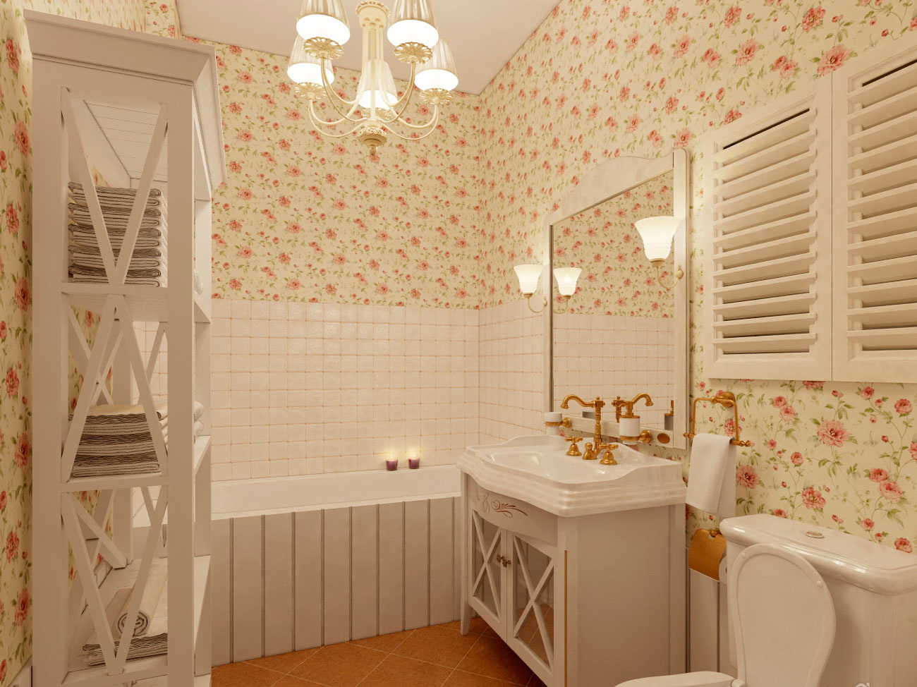 Так, для санузла в стиле прованс или кантри идеально подойдут обои в нежный цветочек. Такие же образцы будут уместны и в современной классике.