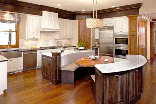 Можно встретить кухонный остров изогнутой формы. Он занимает много места, но удобнее и выглядит оригинальнее.