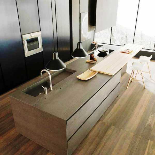 Пусть остров будет простым, а повысить его эффективность можно за счёт увеличения площади рабочей поверхности. Это решение несёт в себе огромное преимущество: удобство в приготовлении и приёме пищи. Лучше, если столешница острова будет изготовлена из материала, визуально отличающегося от того, из которого сделаны остальные рабочие поверхности в кухне.