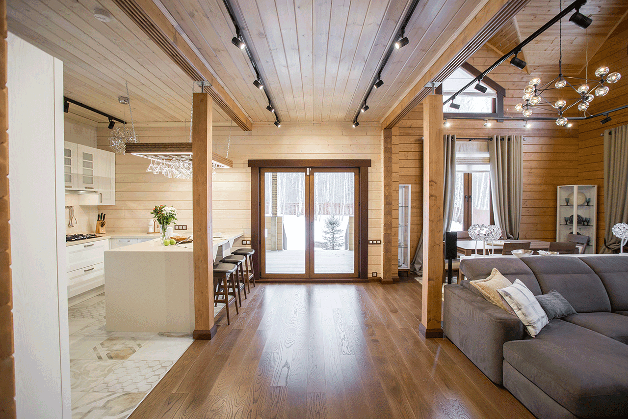 Однако, если неправильно оформить дом из дерева, он будет смотреться как крестьянская изба с невысокими потолками. Поэтому при разработке дизайна интерьера следует учесть все нюансы: меблировку, элементы декора, а также освещение.