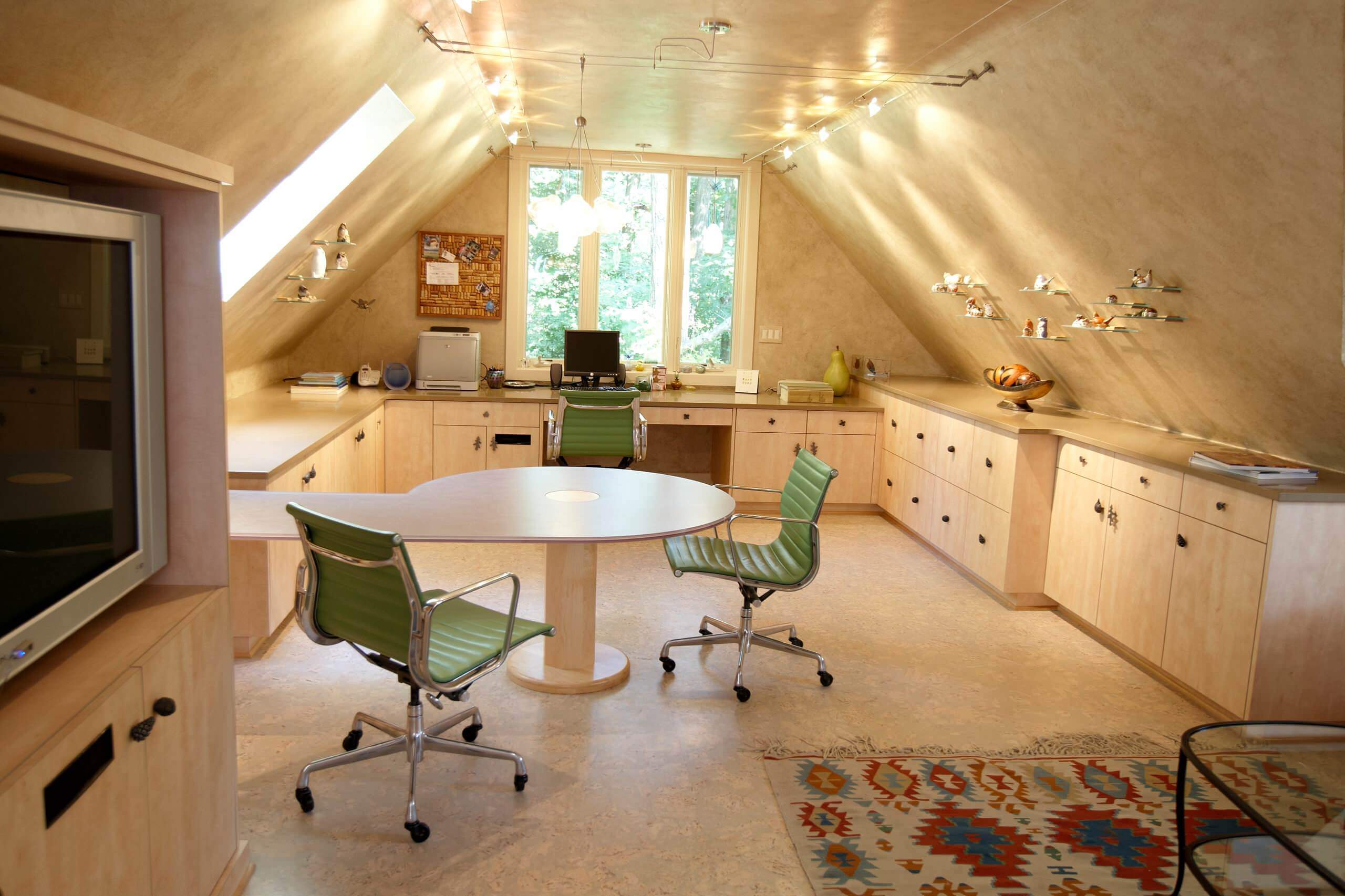 Домашний офис на чердаке с традиционным и простым интерьеромЧердак также является прекрасным местом для домашнего офиса. Он отделен от остальной части дома и находится на отдельном уровне, так что это также место, где вы можете сосредоточиться, не отвлекаясь. Деревянный потолок с большими выступающими балками сделает атмосферу уютной и привлекательной, но в то же время остальной декор будет функциональным.