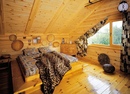 Уютная спальня на чердаке с деревянной отделкой и натуральной отделкойЗдесь чердак превращен в уютную спальню. Потолок не только не окрашен и покрыт натуральным лаком, но и остальное пространство имеет те же характеристики.Кровать тоже деревянная, как и вся остальная мебель. Как будто весь чердак облицован деревом.
