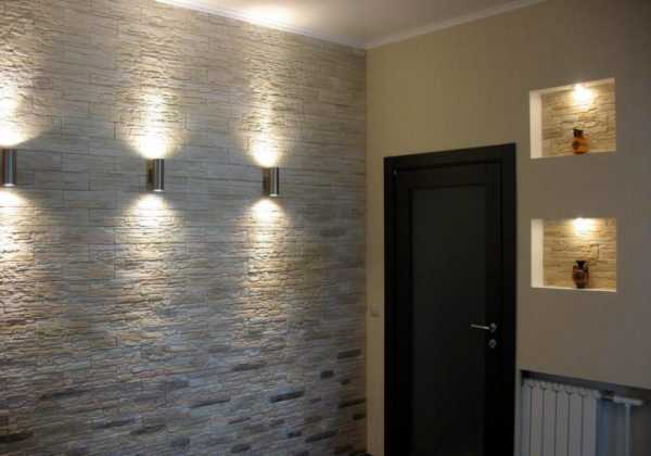 Полезный совет! Стена, покрытая камнем не должна иметь фронтальную подсветку. Такое освещение скроет всю красоту отделки.