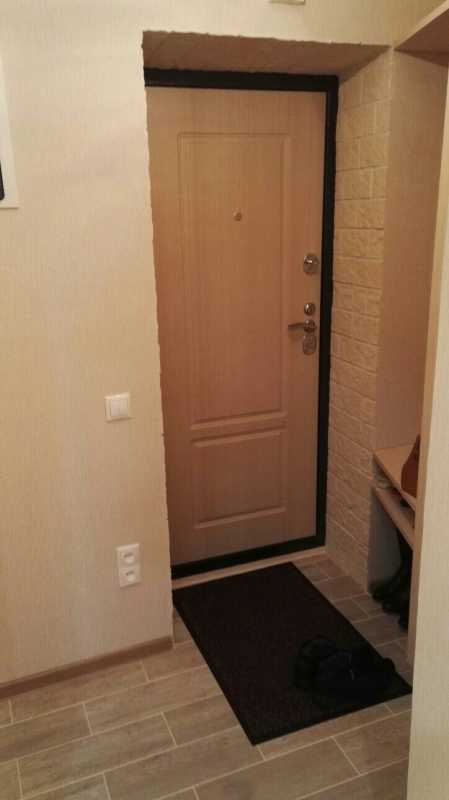 Одна из стен прихожей облицована камнем, остальные — оклеены однотонными обоями
